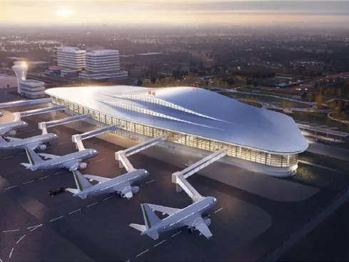 • Letališki terminal z jeklenim okvirjemLetališki terminal z jeklenim okvirjem