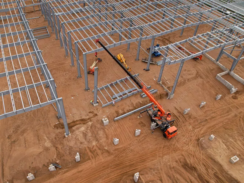 Jeklene komponente, vključno s tramovi, stebri, naramnicami in strešnimi rešetkami, so montažne v tovarniškem okolju. Uporablja se visokokakovostno jeklo, komponente pa se izdelujejo tako, da se natančne specifikacije, da se zagotovi, da se med namestitvijo natančno in varno prilegajo. To nadzorovano okolje omogoča stroge ukrepe za nadzor kakovosti, kar zagotavlja trajnost in zanesljivost komponent.