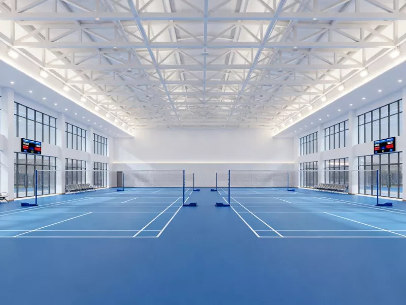Z razvojem sodobnih športnih zgradb je badmintonska dvorana z jekleno konstrukcijo postopoma postala prednostna konstrukcijska oblika pri gradnji prizorišč za badminton. Glavni okvir, sestavljen iz jeklenih nosilcev in jeklenih stebrov, upošteva strukturno trdnost, estetski učinek in ekonomsko učinkovitost ter prikazuje standarde profesionalnih športnih prizorišč. Dvorana za badminton kot zaprto prizorišče mora imeti dober prezračevalni sistem in učinek toplotne izolacije. Dvorana za badminton z jekleno konstrukcijo lahko uporabi okolju prijaznejše in toplotno izolativne stenske materiale, na streho pa lahko namesti sončne kolektorje za pridobivanje električne energije za prezračevalni sistem.