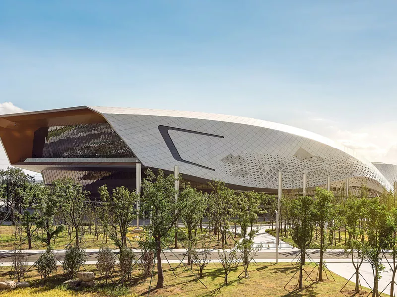 Velik razpon: Montažni kompleks jeklene strukture športno središče dosega večfunkcionalne prožne prostore skozi zasnovo z velikimi stebri brez stolpcev.